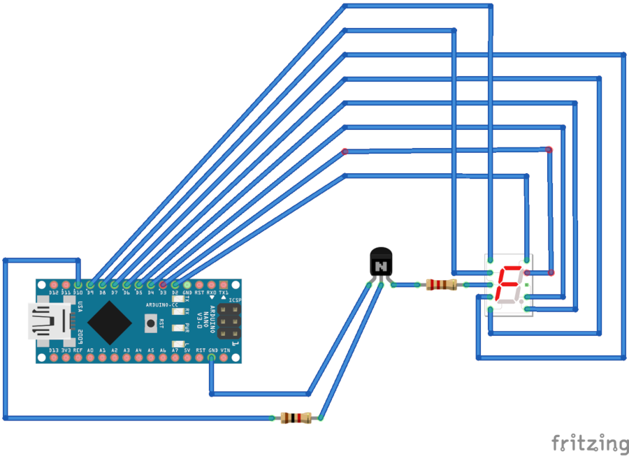 Every segment will have 8 connections to the same 8 pins on the Arduino, and one connection to their own unique pin via a transistor that will control whether the segment as a whole is on or not.