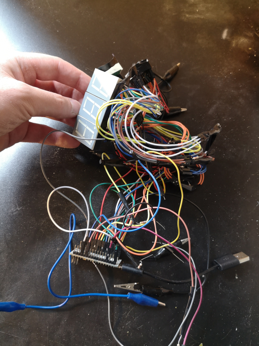 You see, ideally we want it that when they touch, we advance the clock. This means we detect when they're not touching, and then advance the clock when we detect that they do. However, there's a thing called bouncing where, upon making contact, they bounce off eachother a few times. So a single contact ends up getting registered as multiple contacts, and the clock could advance several seconds when it should only advance one (you may have heard of debounced switches which are switches set up to avoid such a thing). I set it up so that if there's more than one contact registered in a short period of time, only the first one is used to advance the time.